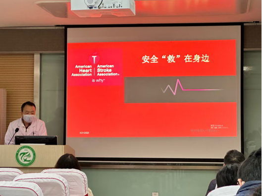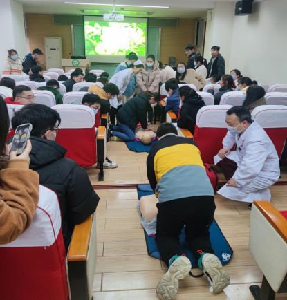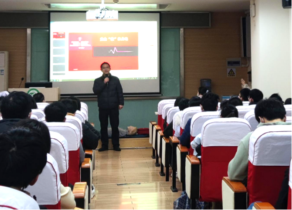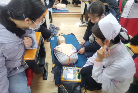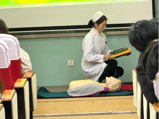 随后,校医院护士杜文丽向同学们讲解了基础的生命紧急事故急救方法,如心脏骤停、窒息、触电等,并通过人体模型向在座师生展示了心肺复苏、除颤仪和海姆立克急救法的具体操作。