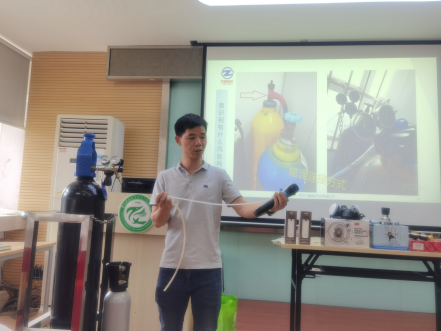 培训会尾声,彭总现场用实物向大家展示了气瓶的各类配件并且讲解了不同配件的使用规则及方法,带领同学操作了气瓶阀门和减压阀的更换、气瓶气路的规范检漏,以及瓶阀连接气管的操作要领。