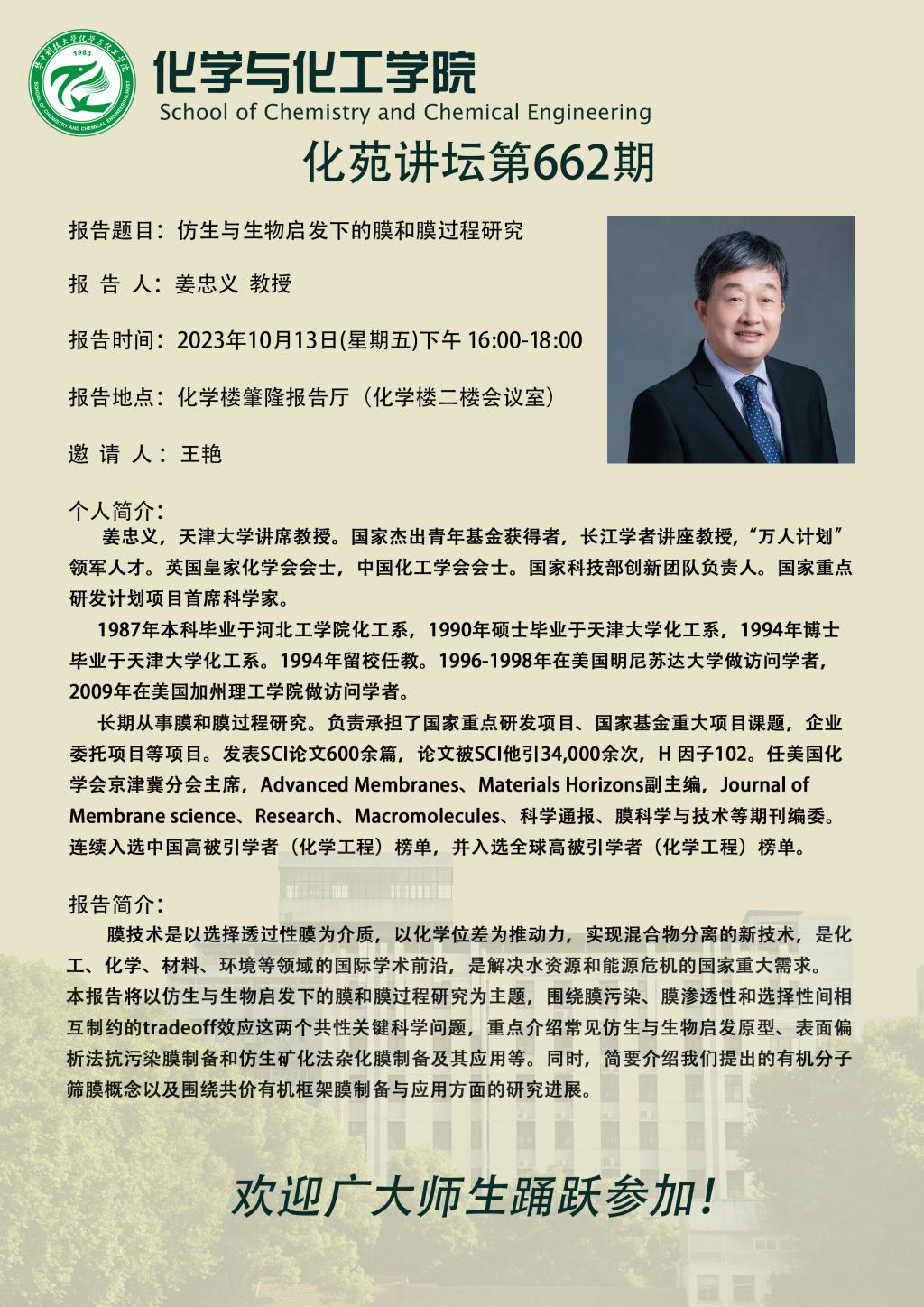 天津大学姜忠义教授做客第662期化苑讲坛