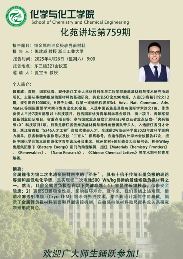 浙江工业大学佴建威教授做客第759期化苑讲坛