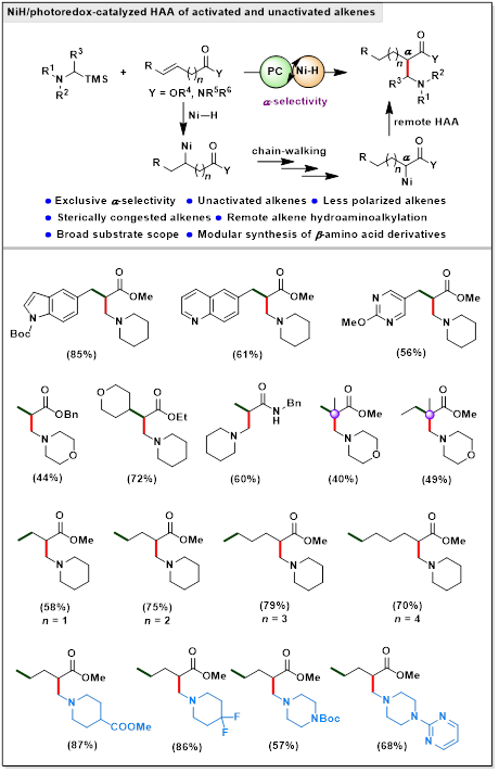 烷基胺广泛存在于天然产物和药物分子中,是一类非常重要的结构单元。因此,发展高效构建烷基胺的方法具有重要研究价值。其中,催化烯烃的氢氨烷基化(Alkene hydroaminoalkylation)是构建烷基胺骨架最直接和高效的方法之一,其原子和步骤经济性很高,同时也是实现烯烃增值化转化的有效途径。过渡金属催化两电子转移过程的烯烃的氢氨烷基化反应由于涉及到N邻位惰性C-H键活化断裂,因此反应条件较为苛刻(高温),官能团兼容性差,底物普适性有待提高。与两电子转移过程相比,通过氨烷基自由基对烯烃进行Giese加成实现氢氨烷基化具有条件温和、官能团兼容性好等优势。然而,由于α-氨烷基自由基具有较强亲核性,受极性匹配因素影响,烯烃底物范围大大局限在缺电子烯烃如丙烯酸酯类型底物;且α-氨烷基自由基通常都是加成在缺电子烯烃的β位(β-选择性),只能获得线性烷基胺。因此,发展新的策略实现α-选择性合成支链烷基胺,且拓展烯烃底物范围到非活化烯烃是亟待解决的问题。