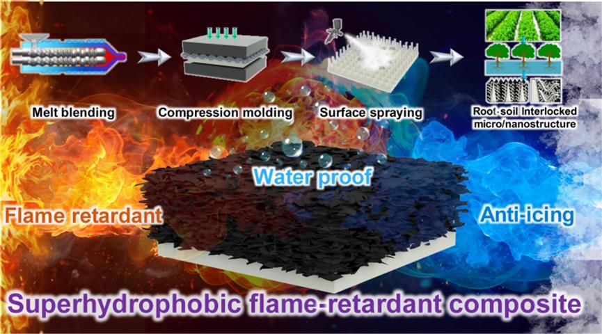 基于此,瞿金平院士华科大团队受河滩防护林根-土互锁结构固土的作用启发,结合工业化的微挤注压缩成型技术和简易的一步喷涂技术,制备了一种具有根-土互锁微纳结构的超疏水阻燃乙烯-醋酸乙烯酯/氢氧化铝复合材料。