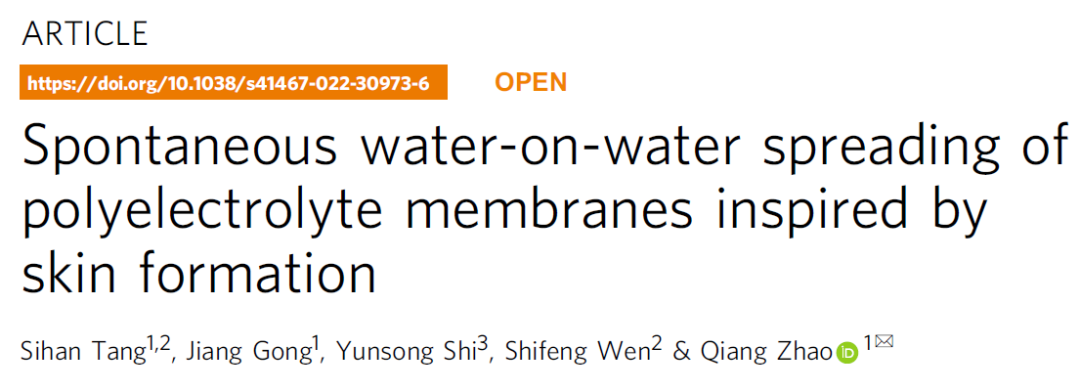 近期,赵强教授课题组在《Nature Communications》在线刊发了该领域的新进展(Spontaneous water-on-water spreading of polyelectrolyte membranes inspired by skin formation, Nat. Commun. 13, 3227, 2022.),提出了一种聚电解质水溶液在水面自发铺展,形成多孔膜的机制。文章第一作者是WilliamHill威廉希尔2020届硕士毕业生汤思晗,合作单位包括williamhill中文材料科学与工程学院,协和医院。研究得到国家自然科学基金,国家重点研发计划和三峡实验室开放基金的支持。
