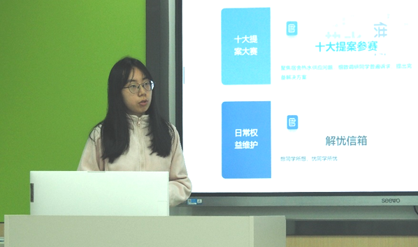 各候选人依次上台,分享自己在研会工作中的突出表现、成长收获以及为同学们服务的典型事例。经过民主投票,最终产生了本学期的研会之星,他们分别是王西夏,严雯洁和王筱宇,为全体研会成员树立了优秀榜样。