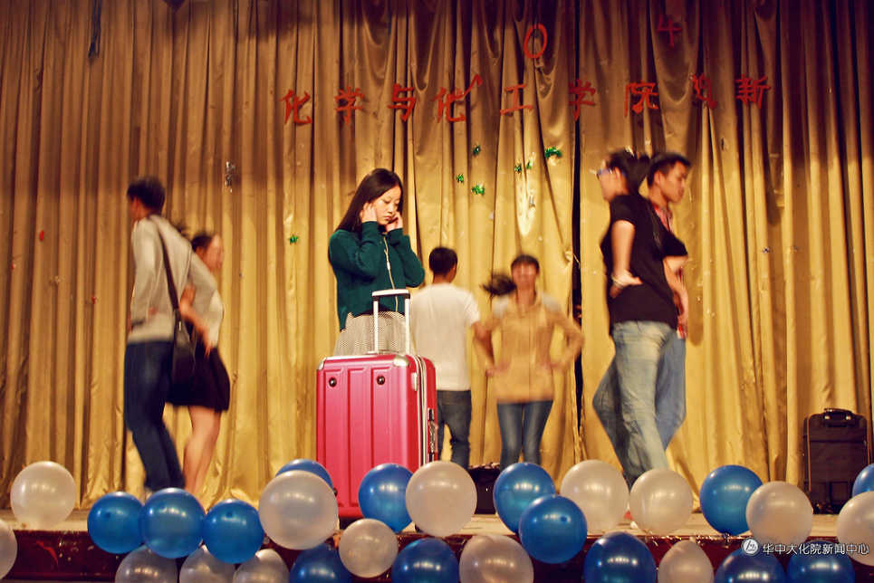 晚上7:20整,在简短的开场白后,或优雅大方或帅气稳重的主持人们正式宣布迎新晚会开始。一曲可爱清纯风格的《mr.chu》以饱满的青春热情瞬间俘获了同学们的眼球。紧接着的话剧《白雪公主》在原来为人熟知的版本基础上融入了许多新元素,如重庆方言,歌曲《对你爱不完》、《小苹果》、《my destiny》,奶茶广告,文学作品《木兰赋》,时事热点“黄金地沟油”等,使晚会氛围愈加轻松愉快。在女生独唱《一个像夏天,一个像秋天》和侦探破案小品《福尔摩斯》 后,晚会进入了通过“微信摇一摇”获取奖品的抽奖环节和游戏环节。在经典游戏--萝卜蹲环节中,现场自愿参与的7名同学分别以“红橙黄绿青蓝紫”萝卜的角色进行角逐。最终蓝萝卜凭借重复自己名字的技巧,夺得第一名。